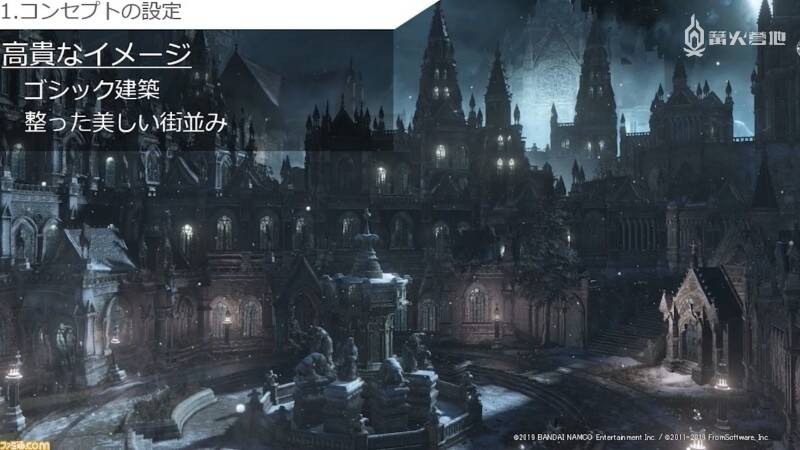 第一大要素是「设定概念」。立石以疑似《黑暗之魂3》中伊鲁席尔城的画面为例,对每处细节的概念设定进行了说明。她说自己初次看到这个画面时只是单纯觉得「这是一座美丽的城市」,直到问了设计师前辈才知道采用哥特式建筑打造这座城市街景是因为这里居住着众多贵族。此外,她还从设计师前辈那里得知了「发达城市的附近必定有适合运输的河流」。而事实上,这张地图也确实设置了河流。