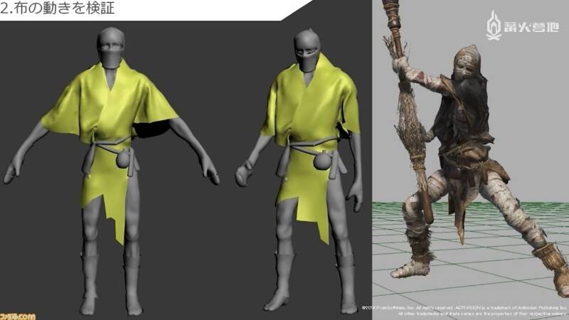 此外,制作组还对布料的动态效果进行了反复的验证。角色身着服装时,袖子等布料会发生摇摆,因此制作组会先给角色准备一套临时的服装并据此调整模型。有了这道工序,游戏中的布料才能实现更加自然的动态效果。