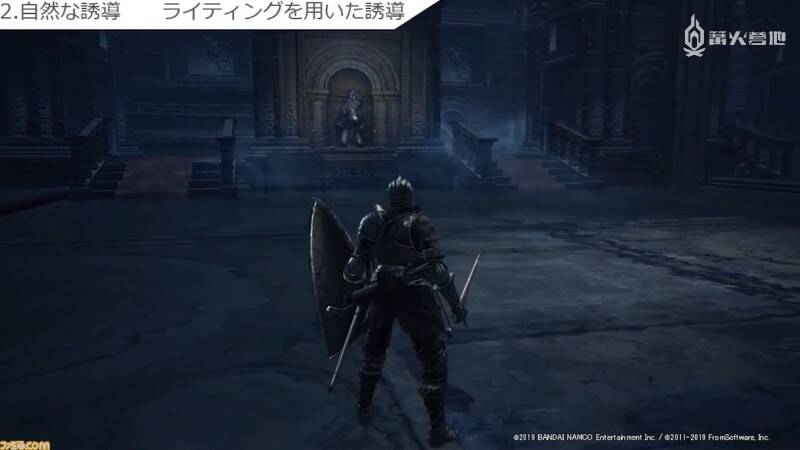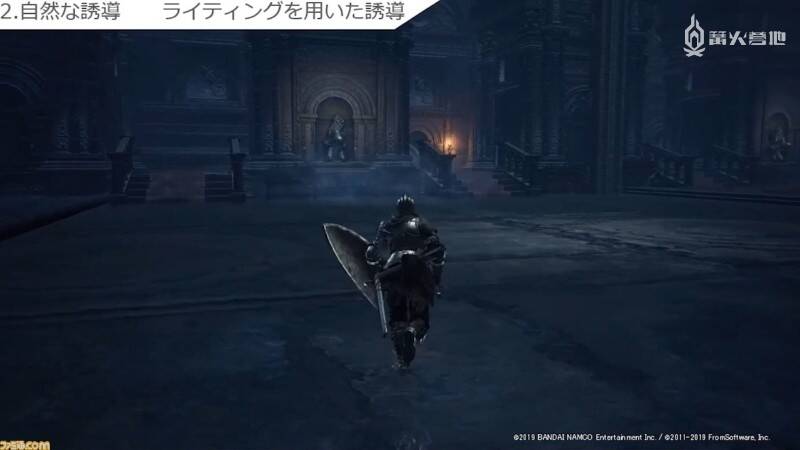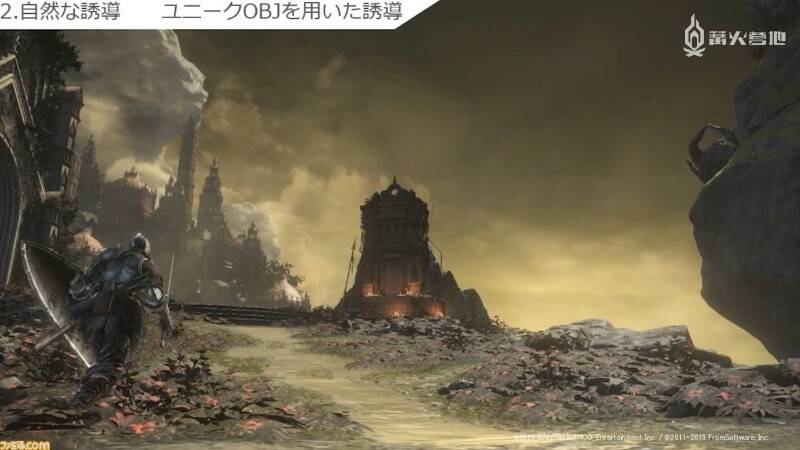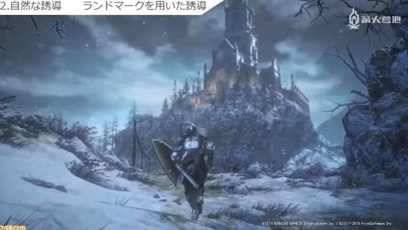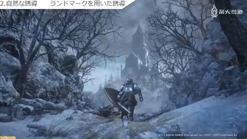 下图为《黑暗之魂3》中玩家从阿里安德尔雪原向礼拜堂前进的场景。站在吊桥前面就能看到礼拜堂,因此很容易让玩家察觉到目的地就在那里。但如果做得太过刻意的话,反而会让玩家产生「被游戏制作组牵着鼻子走」的感觉,因此设置地标的重要之处在于要让它自然地融入背景之中。立石个人的兴趣是爬山,因此她从中发现了许多地标设置的共通点,她认为「这就像是在爬山过程中看到山顶时会不由自主地感到精力充沛一样,因为这说明终点就快到了」。