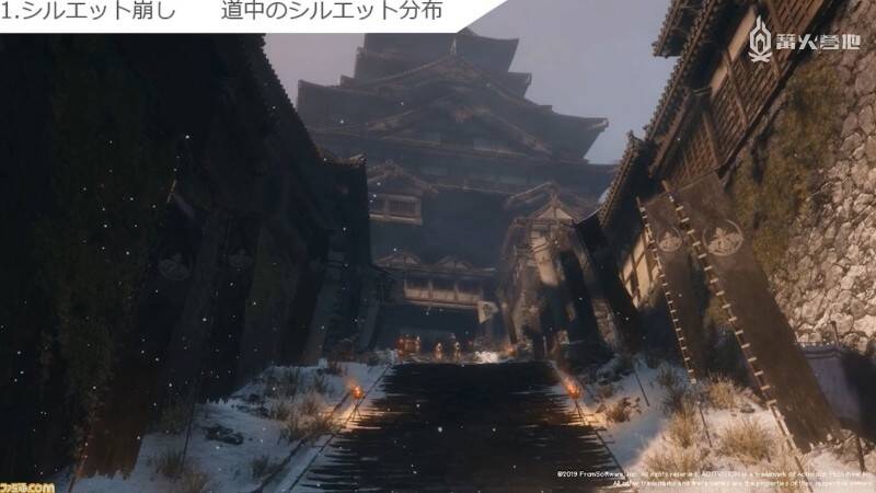 立石说,沿途放置的物件最好是能增强世界观构建的物品。以苇名城主城为例,第一张图中没有放置任何物体,显得有些冷清。在左右两侧放置火把、旗帜、岩石之后,场景才变得生动了起来。