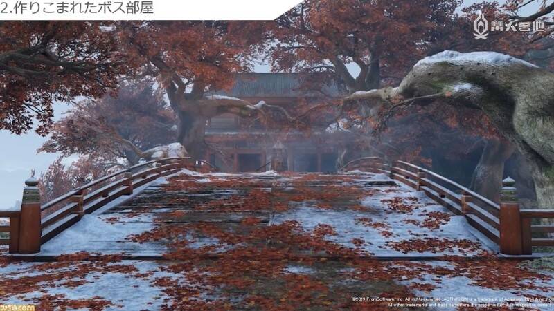 《只狼》中的朱桥。放置的物件虽然简单,但在积雪和红叶的映衬下,这一场景却给玩家留下了更深刻的印象。顺便一提,立石说她在这里卡关了(笑),可怕的源之宫破戒僧