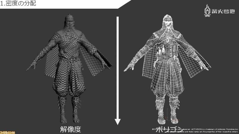 重新拓扑就是将精模转换为可以用在游戏中的低模。为了将精模中的高质量细节原汁原味地反映在游戏中,制作组投入了大量的心血。由于这里完全是面向游戏开发者进行说明的,因此本文只展示幻灯片截图,不深入介绍解说内容。