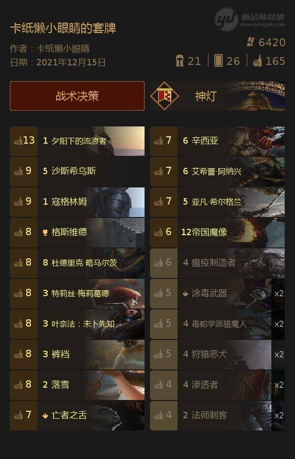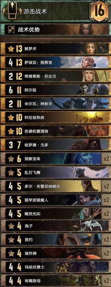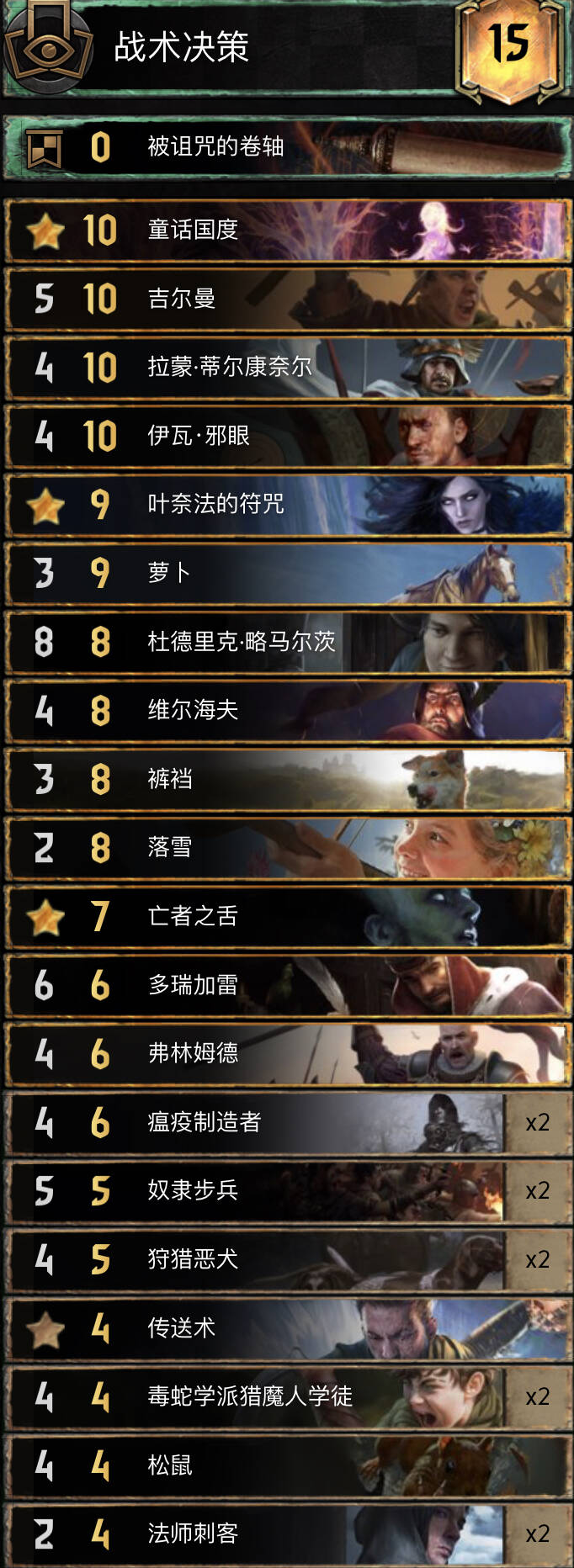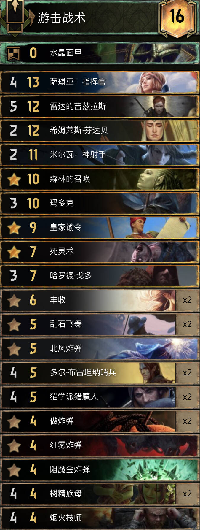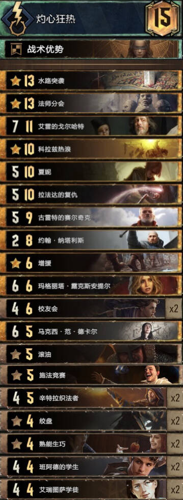 这套缺点是先手牌很少,调度压力较大,舌头不一定要全吃渗透者,可以留一个在手上,吃一个猎魔人(防止辛西娅阿蕾娜不上手先手没牌出),解牌也不多,就俩打五(毕竟硬塞了俩体系),优点是r2r3有揭示,领袖落雪,91哥三套大爆点,如果对面不知道你有揭示很容易和你打短r3,然后被揭示打懵,(但是r1真的很弱,推荐骗几张赶快跑,可能被平卡就留5-7牌,r2八牌时拍落雪同样平卡拿下,r3有揭示+91哥基本没得输,对面准备莽的话r2交91也行)塞也很能干扰滤牌一般的辛迪加北方和怪兽,打帝国最好别滤太急,防一下烫头,打松鼠舌头可以吃打五(反正塞回去露琪亚也会拉出来,而且气宗也没几张卡给你解)