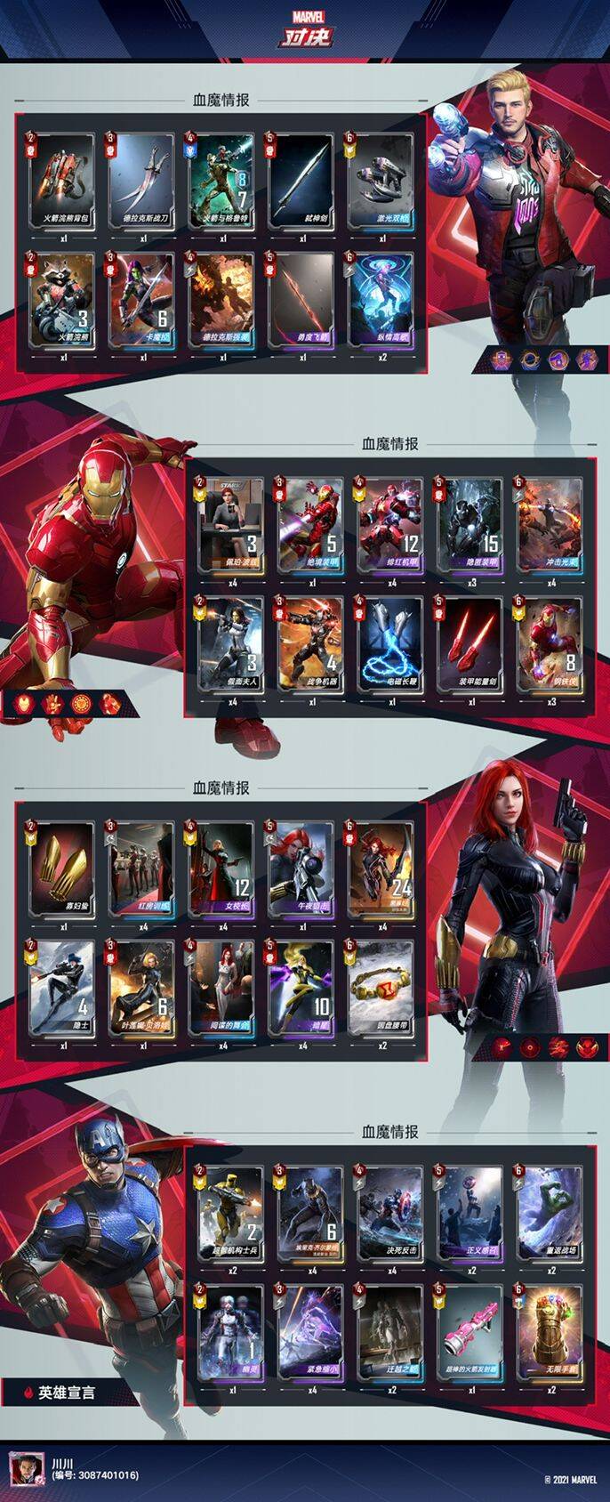 恐惧本源黑寡妇2-4张、钢铁侠3张、冲击光束4张、纵情高歌2-4张、圆盘腰带2张