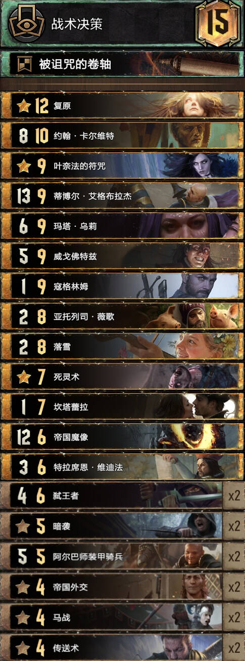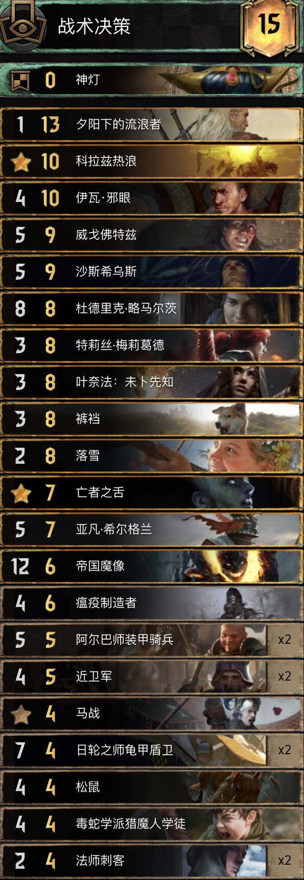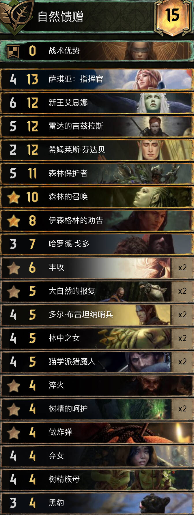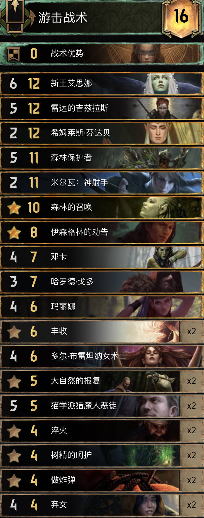 阿尔祖和剧情是两个大爆发,所以要尽可能赢下R1,R2看情况出牌,理想情况是R3手里只有一手解梦阿尔祖加戈多。当然如果R1开掉了岳父,R2需要逼牌的话也是能开解梦阿尔祖的。然后这套牌调度压力较大,岳父要尽量早交,如果不是R2逼牌且手里有大量位移的时候要确保米尔瓦不能上手,不然不交两个爆发点数根本不够。然后两个树精最好是能骗到解,最重要的单位是先知,如果骗不出解两个树精最好一起出永动,如果丰收顺便再能开出个哨兵还是很猛的。然后就是注意一下丰收BUFF的对象,内战的时候不要BUFF到4点的单位,这样对面解起来会很难受,打其他阵营的时候最好能BUFF到4点的引擎,除非创造出女术士或者先知或者树精在场时的哨兵,不然以BUFF对象和修点精灵优先。