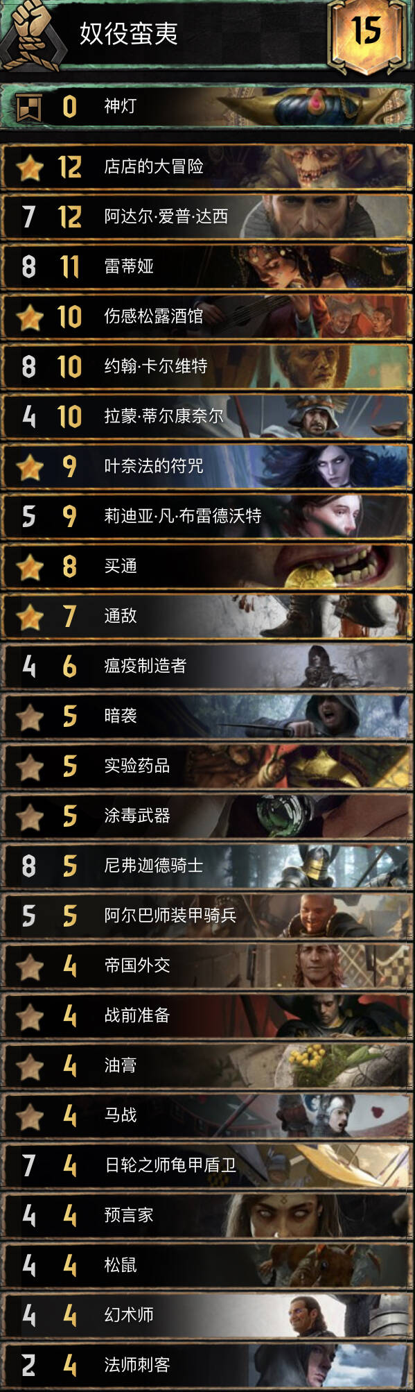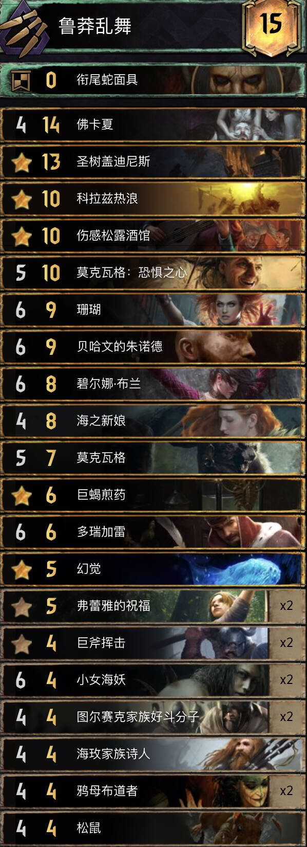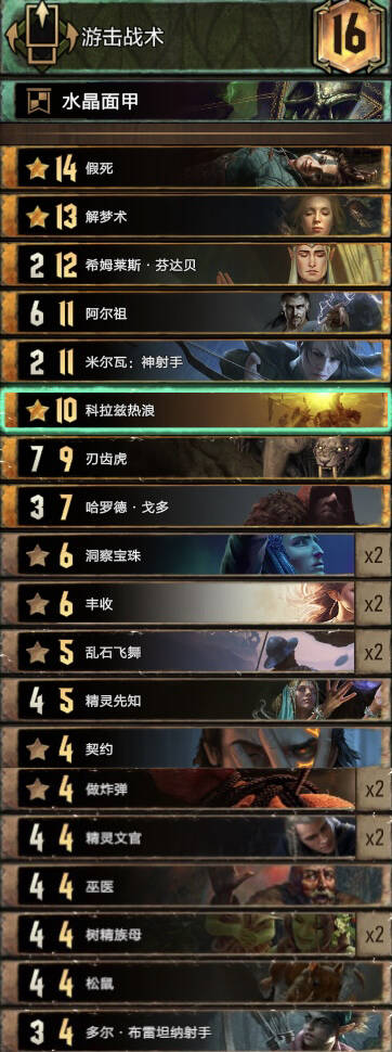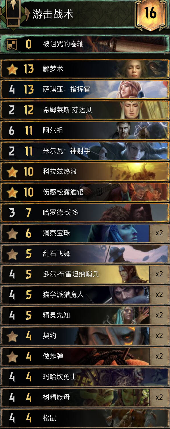 阿尔祖和剧情是两个大爆发,所以要尽可能赢下R1,R2看情况出牌,理想情况是R3手里只有一手解梦阿尔祖加戈多。当然如果R1开掉了岳父,R2需要逼牌的话也是能开解梦阿尔祖的。然后这套牌调度压力较大,岳父要尽量早交,如果不是R2逼牌且手里有大量位移的时候要确保米尔瓦不能上手,不然不交两个爆发点数根本不够。然后两个树精最好是能骗到解,最重要的单位是先知,如果骗不出解两个树精最好一起出永动,如果丰收顺便再能开出个哨兵还是很猛的。然后就是注意一下丰收BUFF的对象,内战的时候不要BUFF到4点的单位,这样对面解起来会很难受,打其他阵营的时候最好能BUFF到4点的引擎,除非创造出女术士或者先知或者树精在场时的哨兵,不然以BUFF对象和修点精灵优先。