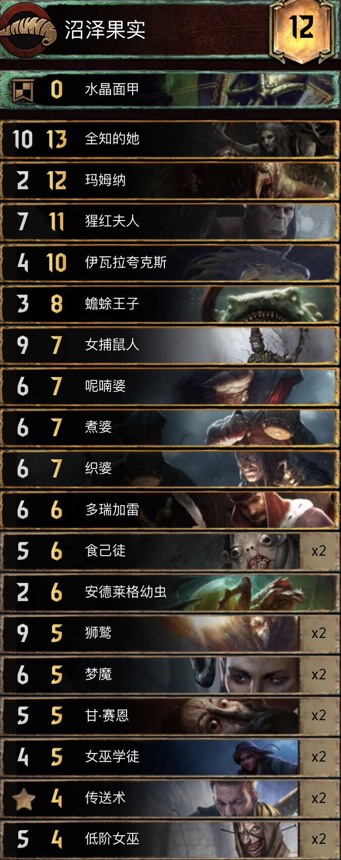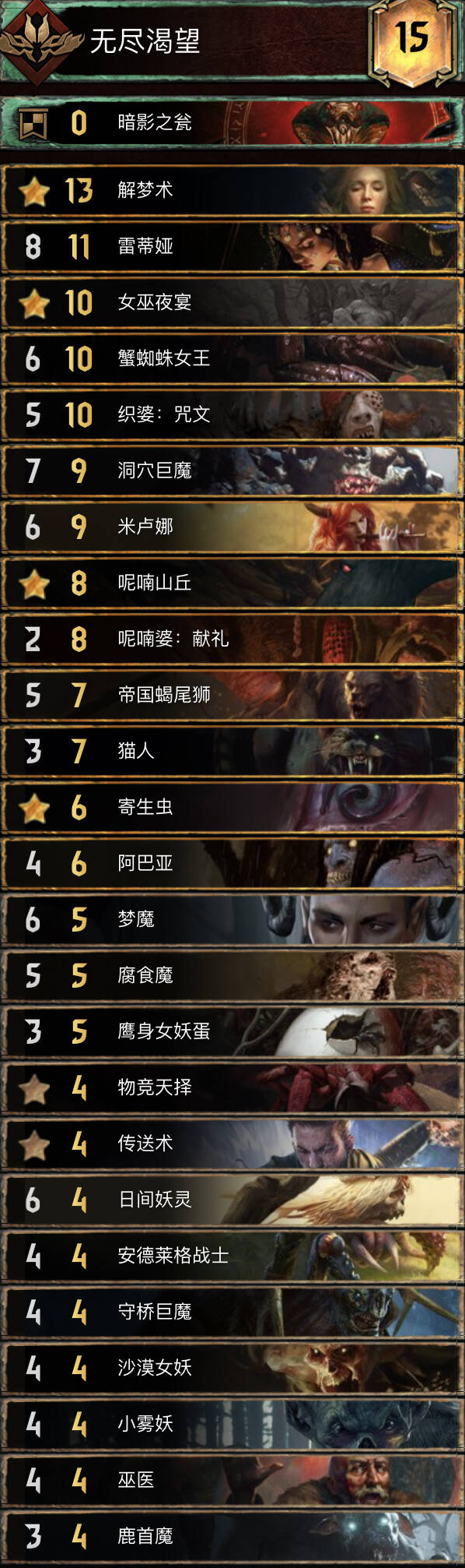 思路就是蟹蜘蛛女王吞织婆,然后用阿巴亚、蕾蕾、暗影之瓮来触发女王的遗愿,生成更多织婆,这样每张遗愿牌能打出 成吨收益。到了r3,再用女巫夜宴把女王和织婆拉上来,再重复一遍。为了combo稳定性带了很多检索,贪一点也可以塞个剧情进去,上限更高。