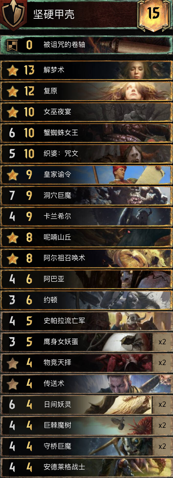 技巧:r1手牌有织婆,用卡兰希尔、复原术组成comb。r1手牌无织婆直接下卫士、织婆、蟹蜘蛛女王,尽量留阿巴亚。复原术和阿巴亚同样是comb。
