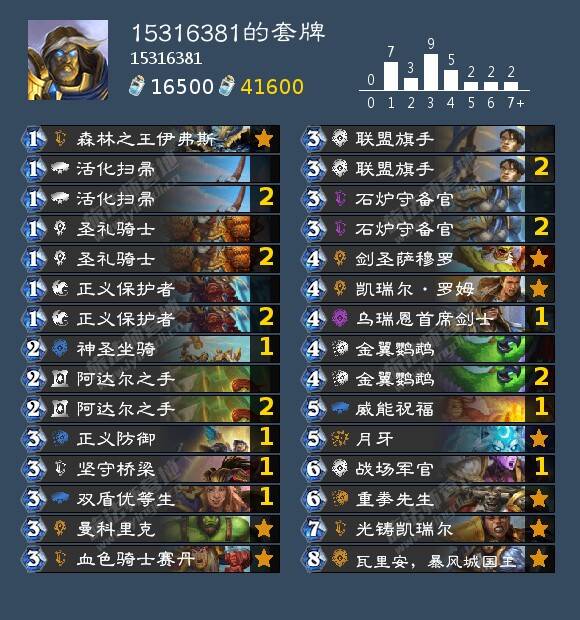 个人觉得圣骑士的核心理念是场面和节奏。场面决定你的赢点,节奏决定能到达赢点的快慢。从整体上看,圣骑士的爆发不是像T7猎一样,前期的疯狂输出;也不是像法师一样,后期超强的爆发。而是,中期,具体来说是3费至7费之间。所以我这套卡组就是为了在中期站住场面,赢得比赛。