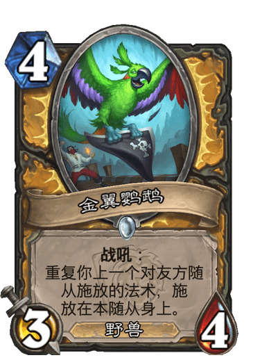 配合型卡牌。一般要等buff完别人才上他。既可以选择221buff来过牌,又可以选择588buff来造大怪。一般来说,先用588buff造出一个大怪让别人先解,后续在上鹦鹉,让别人疲于奔命。