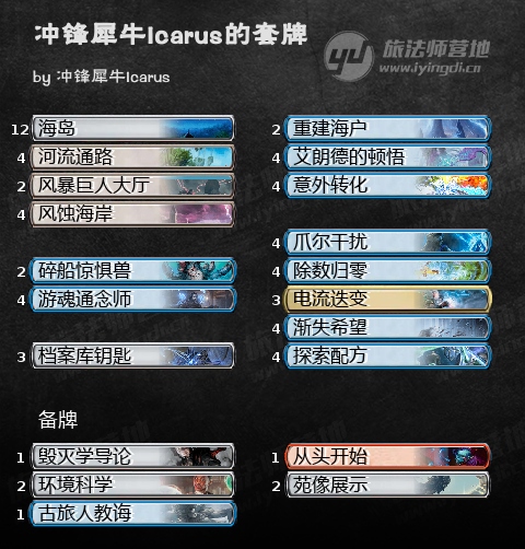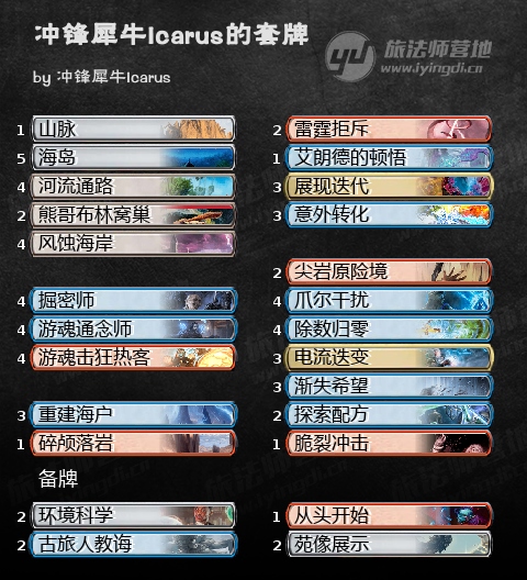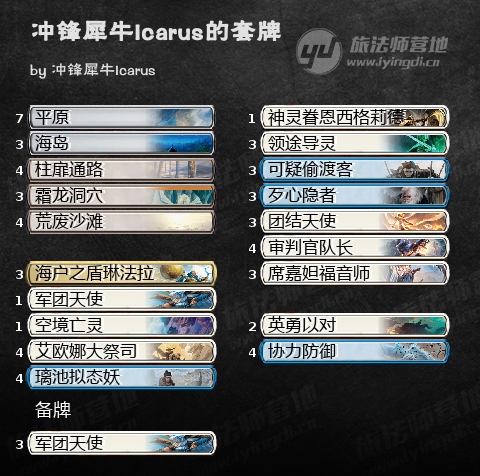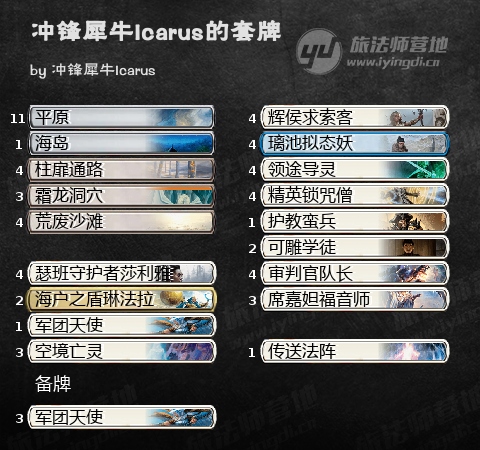 这套牌正是我之前提到的白蓝冒险团套牌的上位替代。瑟班守护者莎利雅比艾欧娜大祭司厉害,是吧?这套牌已经非常好了,我唯一的修改是加入了传送法阵。我觉得能够用出它来的话,回报还是很丰厚的,不过我不想抓到复数张。白蓝快攻现在处于炼金前列,与它竞争的套牌还有红蓝惊惧兽、大黑控和纯红龙。