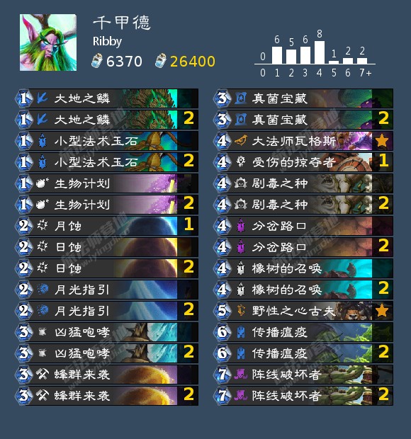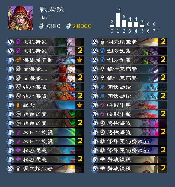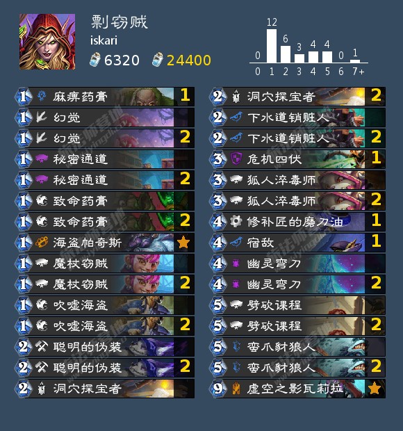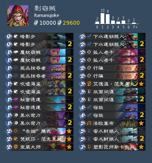 iskari(不是iksar)打到260名的剽窃贼。构筑上节奏感更强一些,主要依赖偷牌后的各种节奏牌抢先手以取胜。可以考虑携带变装大师提前使节奏牌生效。