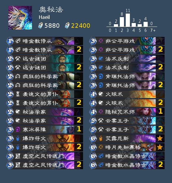 Haeil亚服“登顶”所用的三套卡组之一——奥秘法。由于亚服前2位是公认的齿轮哥,所以第3=登顶。
