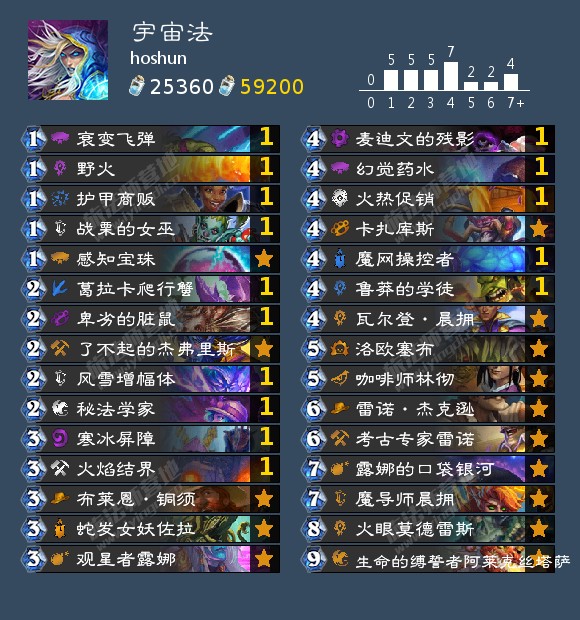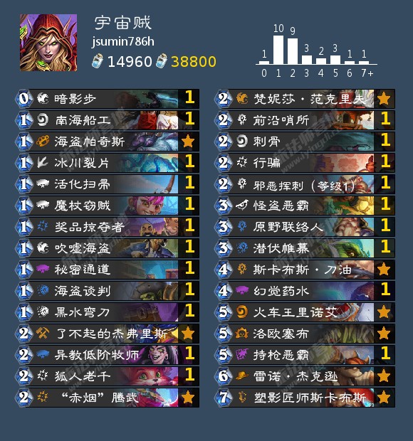 jsumin786h 15胜3负打到37名的宇宙贼。宇宙贼的致胜点在于其优异的节奏与控场手段,先用杂毛蹭脸然后再利用反复回手的洛欧塞布/火车王里诺艾等完成终结。由于八爪机器人变成了3费,节奏过于臃肿,因此卡组放弃了八爪鱼+大范的组合,转而选取了更扎实的前沿哨所及剽窃体系卡牌补充手牌资源。