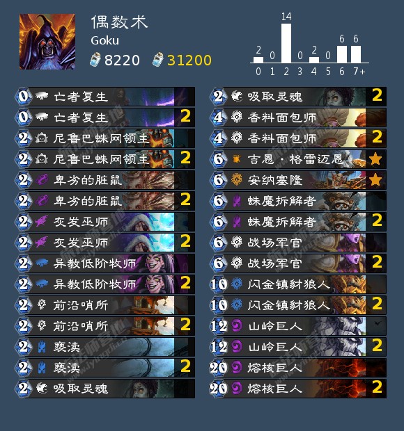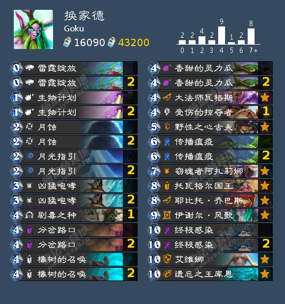 同样来自Goku的一套偶数术,这回他抄了Whitedelight上个版本的全针偶数术,然后一口气打出了17-1的哈人战绩。为了尼鲁布非常针对萨满,萨满需要至少两费来处理尼鲁布,并且萨满的场面清理只有一套。在他的HDT记录中只输给了一个法师。