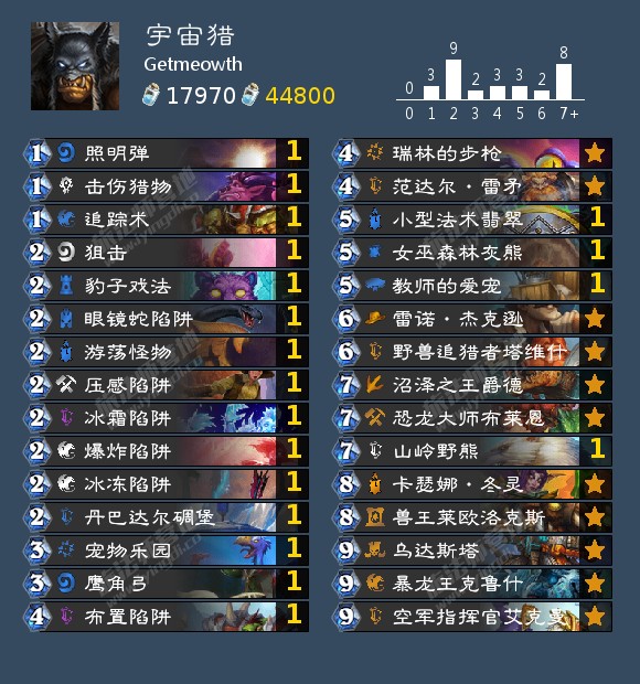 来自Getmeowth直播时8-1打到100名的宇宙猎。我原本以为我的收藏很全面直到我发现我这套牌缺卡。Getmeowth的唯一评价是如果你被这套卡组骗尘了请责怪Corbett。整体上是一套非常有意思的卡组,由于我自己也玩不起所以不好评价这套卡组。缺卡慎合,卡全的同学们可以试试。最后放一张他的粉丝给他发的效果图。高声呼喊雷矛氏族从不低头,相信你也可以把把6费击败对手。