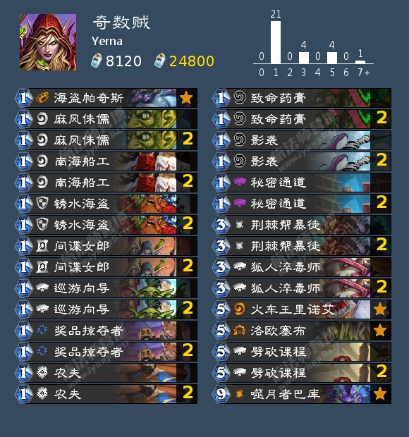 Yerna从800名上至前百所用的奇数贼。当前萨满多的环境,场面不起作用,直伤才是真王。基本上满编了一切奇数贼可以携带的直伤,打脸就完事了。