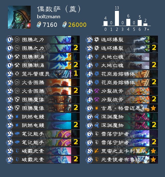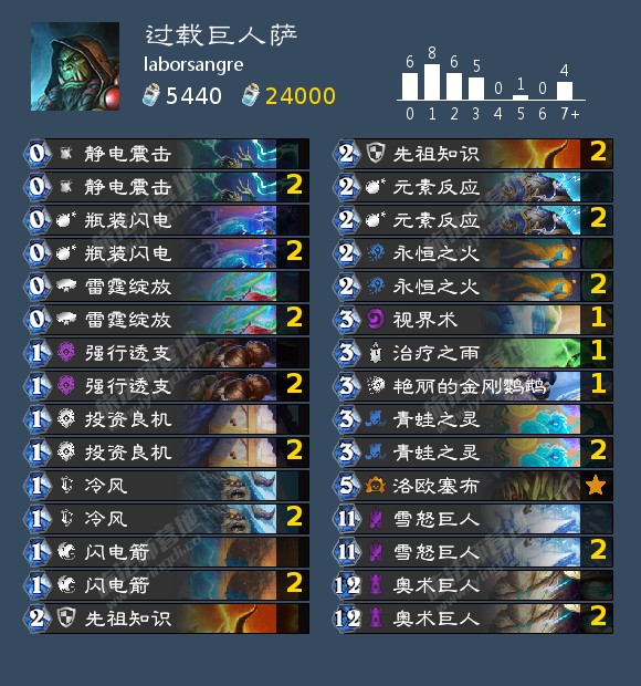 来自laboresangre的过载巨人萨。在我的印象里,他玩这种体系的萨满要比国服的几位高手早一个多月左右,但构筑并不如国内构筑完善。整套卡组只带了唯一一张可供鹦鹉重复的战吼——洛欧塞布。两回合的封魔是当前绝大多数卡组顶不住的。在牌序优秀的情况下,萨满被削了一费的雪落守护者也难以关注过载巨人萨的攻势。卡组上手难度较高,推荐先进行练习后再用于天梯。