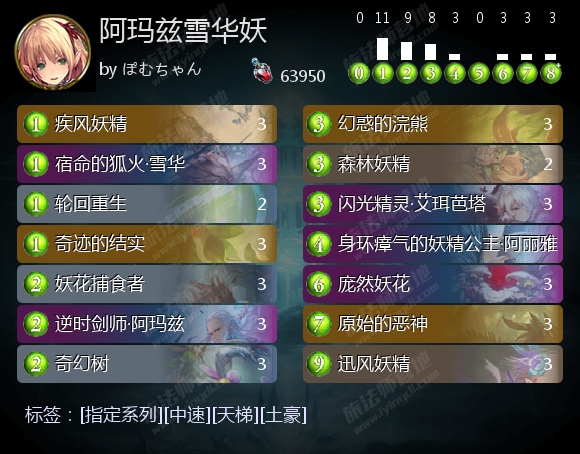 雪华妖是围绕身环瘴气的妖精公主·阿丽雅运作,以宿命的狐火·雪华为主要制胜手段的中速,擅长解场,并能在后期打出高额空场斩杀。