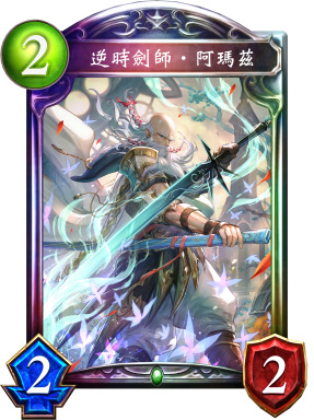 对守护教、谢幕曲死时,优先保留逆时剑师·阿玛兹到后期,利用离场20效果解决对手的爆能圣辉女剑士,或神异形·赛勒斯特号+异族魔境·克里斯托福主战者效果的场面。对进化皇时,如果没有雪华,也应保留阿玛兹,用于处理荣胜剑士。在离场20效果不重要的对局中,可以在中期积极进化阿玛兹刷离场数。为此可以保留足够的低费随从配合他。