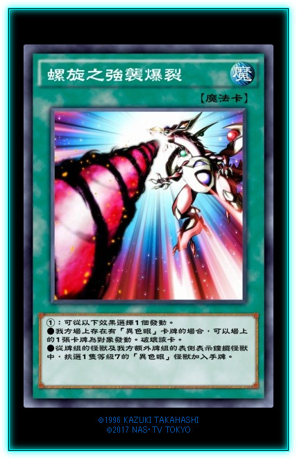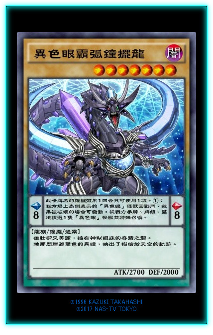 本次卡盒的封面,异色眼的全新大哥。灵摆通常怪兽,拥有非常优秀的8刻度,灵摆效果给予了【异色眼】怪兽一回合一次的诈尸效果,而且还可以从牌组拉,可以拉自己哦。加强了异色眼卡组的赖场能力,异色眼卡组必须满编的卡。可以被【天空的虹彩】检索,灵摆区域被破坏的卡也可以触发效果。