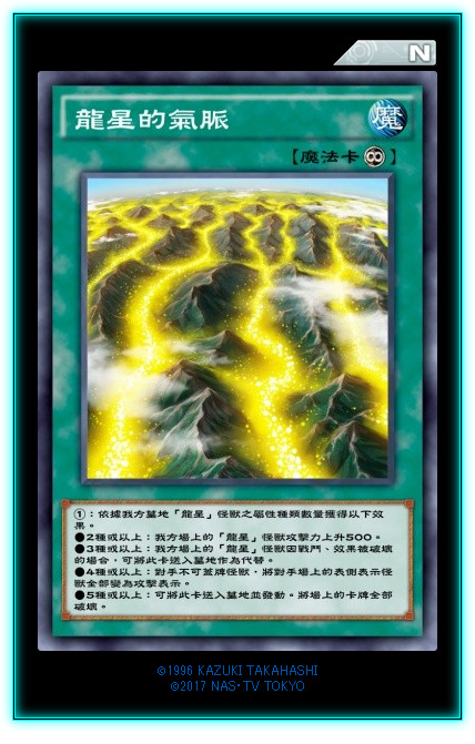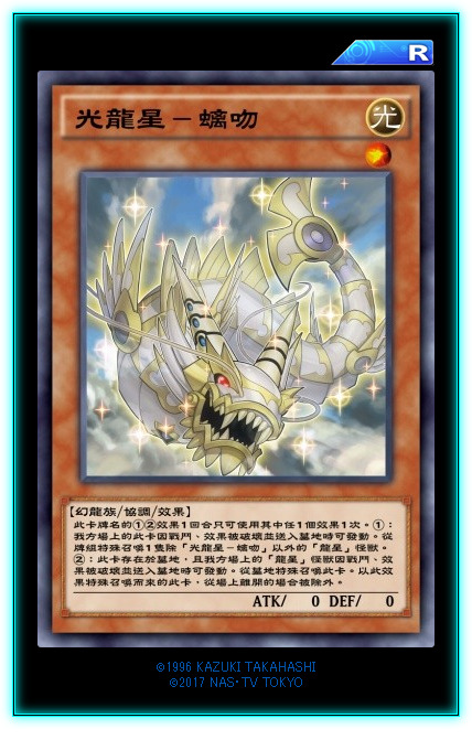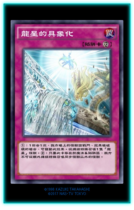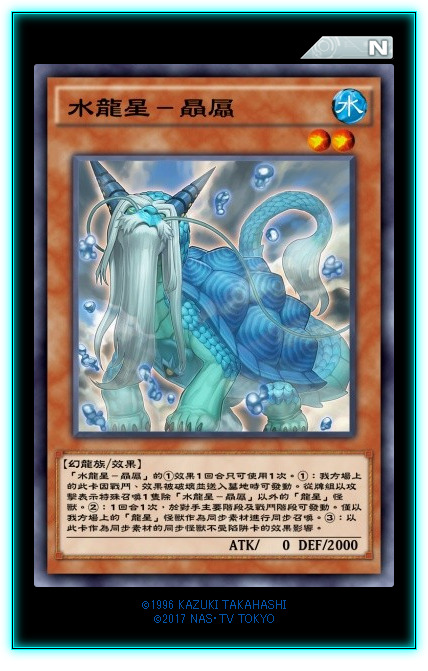 龙星本家下级怪2只,一个提供魔法抗性,一个提供陷阱抗性,目前来说1星的龙星比较尴尬,虽然魔法抗性对付月之书很有效。2星的水龙星适合先手做场,有陷阱抗性,站场很稳。