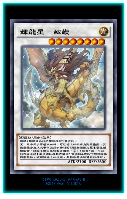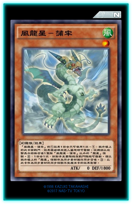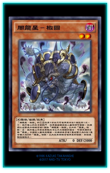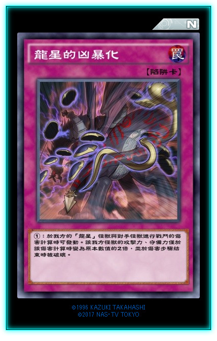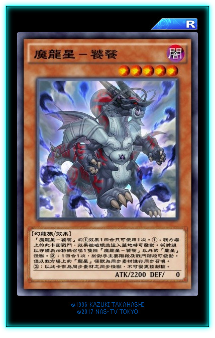 新字段【龙星】。本家二哥,召唤条件限制了幻龙族,基本就是龙星本家出。①效果,取对象弹卡,一般来说,最少弹1,大多数情况都能弹2。②效果也是取对象效果,炸自己一卡苏生墓地一只等级或者以下的怪兽。虽然召唤条件不太泛用,但是两个效果倒是都挺泛用的。