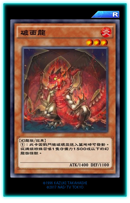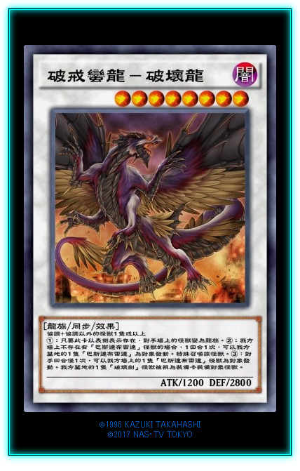 破戒蛮龙!!!它!!!来!!!啦!!!千呼万唤了3年多,蛮龙终于登陆DL啦!!!破坏剑终于不用带DNA改造手术啦!!!②效果是在伴龙和布雷达出了这个卡之后再苏生布雷达出来,然后在对手回合利用效果给他装上那几把剑中的1个来封锁。但是DL没有龙破坏剑。