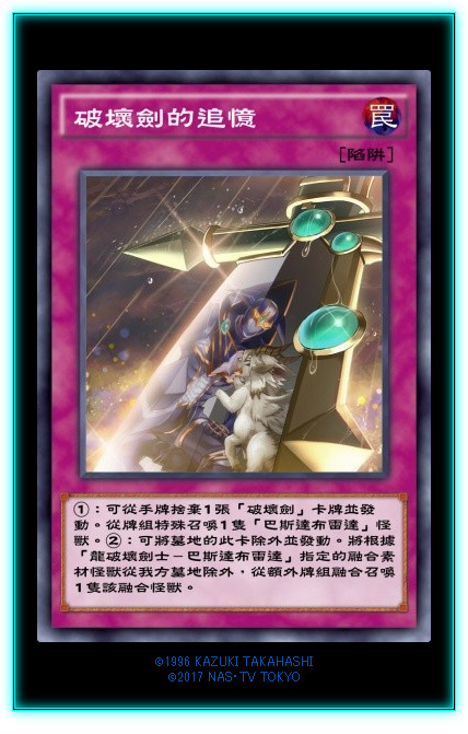 破!!!坏!!!剑!!!k社你终于想起来破坏剑还有卡可以出啦!!!追忆的主要作用是在堆墓后的②效果,二速墓地融合。①效果属于隐藏效果。