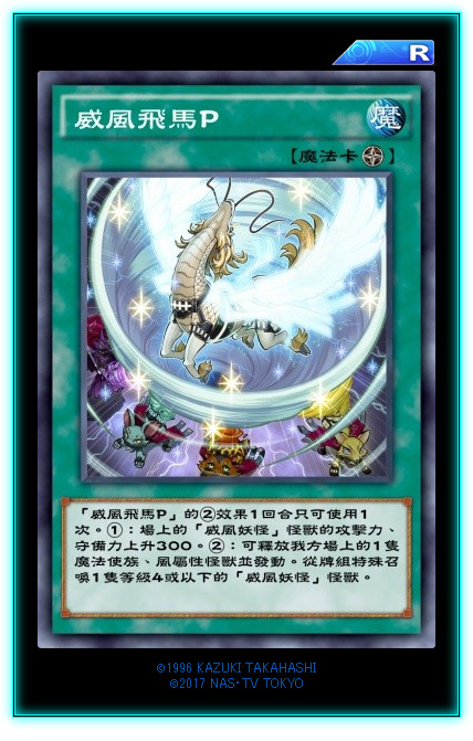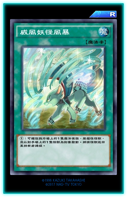 新字段【微风妖怪】。全家均为风属性,魔法师族。本家怪兽全员均无灵摆效果,且都具有水召抗性,但是下级打点都非常惨不忍睹。此卡的①效果为本家怪兽检索。
