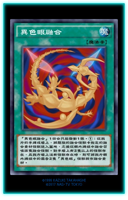 带【异色眼】字段的龙族泛用融合,可以被【天空的虹彩】检索。后面这段可以用额外最多两只【异色眼】怪兽做融合素材的前置条件太多了,估计是不好达成。