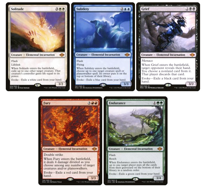 呼魂元素设计最好的地方在于它们践行了万智牌的理念——万智牌是一个基于有限资源的游戏。免费施放它们的代价可不小,但它们也致敬了现行的生物设计思路,作为多元的威胁手段,它们也可以通过生拍来马上制造改变战局的效应。这是一种令人生畏的新旧理念的结合,在摩登赛制中,它们恰到好处。