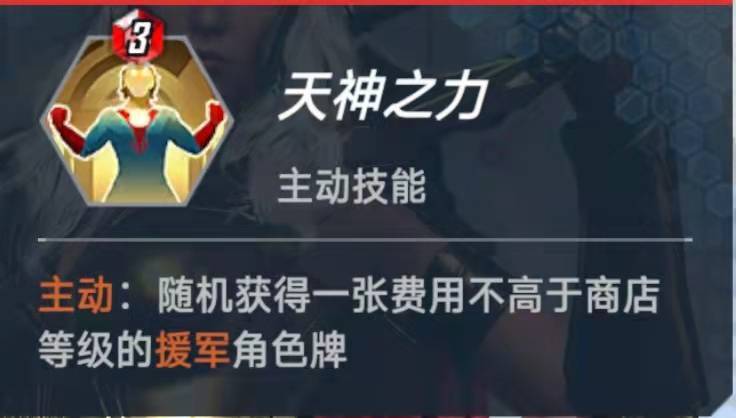 主动技能,随机获得一张费用不高于商店等级的援军角色牌。