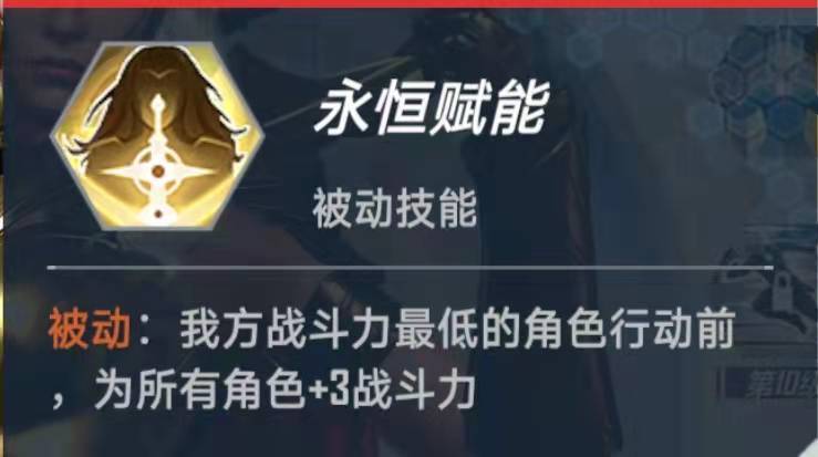 被动技能,我方战斗力最低的角色行动前,为所有角色+3战斗力。