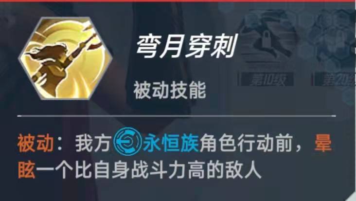 被动技能,我方永恒族角色行动前,眩晕一个比自身战斗力高的敌人。