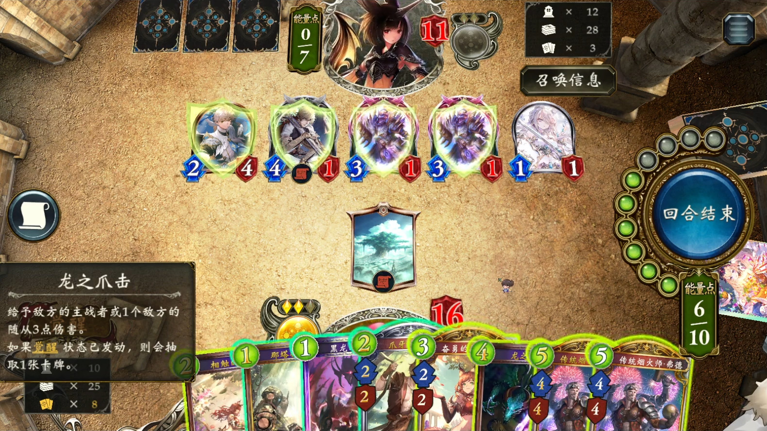 觉醒后优先爆能使用龙枪战士·罗文。6费时无事可做的话,也可以爆能罗文。优先用暴戾龙人搭配爆能罗文,也可以进化战斗兵配合爆能罗文,或在爆能罗文后使用猎龙砍击。