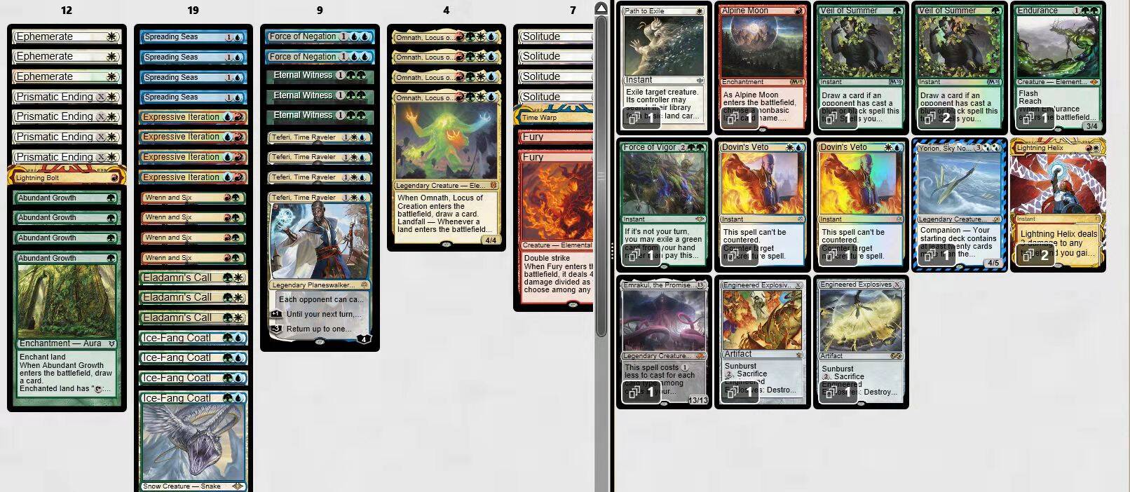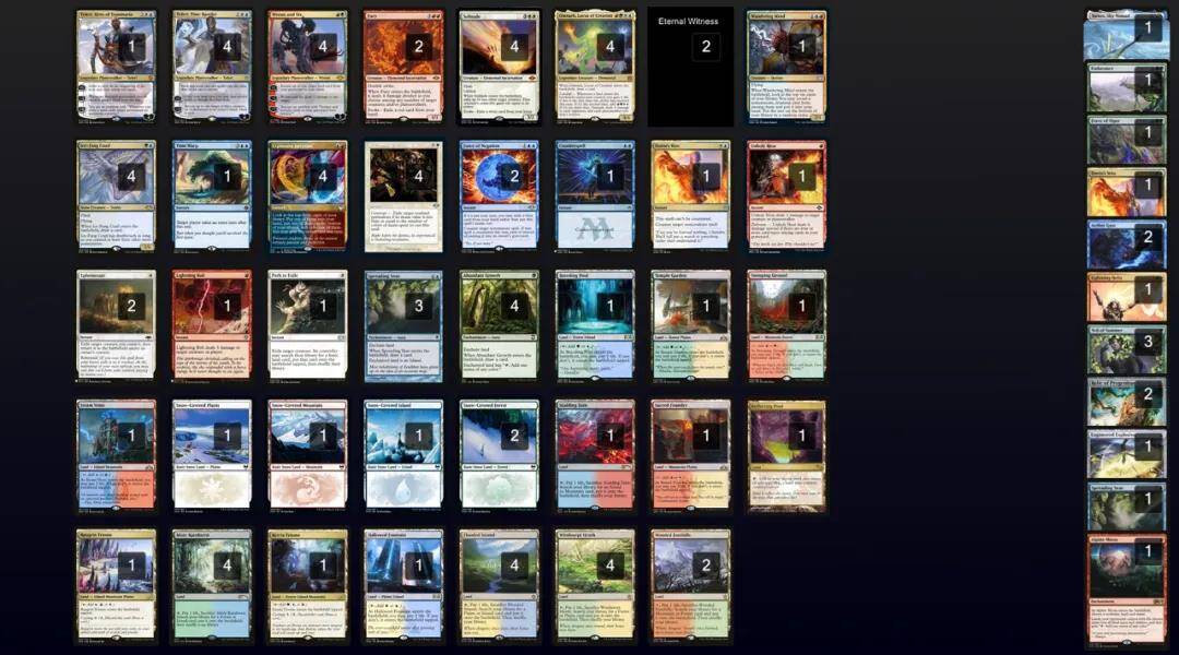这两张牌都非常契合套牌计划,分别提供了两种截然不同的功能。不朽见证人与流光烁影配合已经家喻户晓,以整个坟场为目标的灵活性也使得其成为套牌中的万精油单卡。这里聊一下游荡妖灵的测试结果,321飞行本身就非常厉害,高达看6张的深度也能使你快速找到流光烁影,旅法师,展现迭代,去除等单卡。颜色方面红蓝也不是非常卡手,能成为fon和怒火的养料,比起不朽见证人的2绿来说更加容易出。用一张合理,不过最近玩下来更倾向于直接换成艾拉达力的召集增加套牌稳定性。