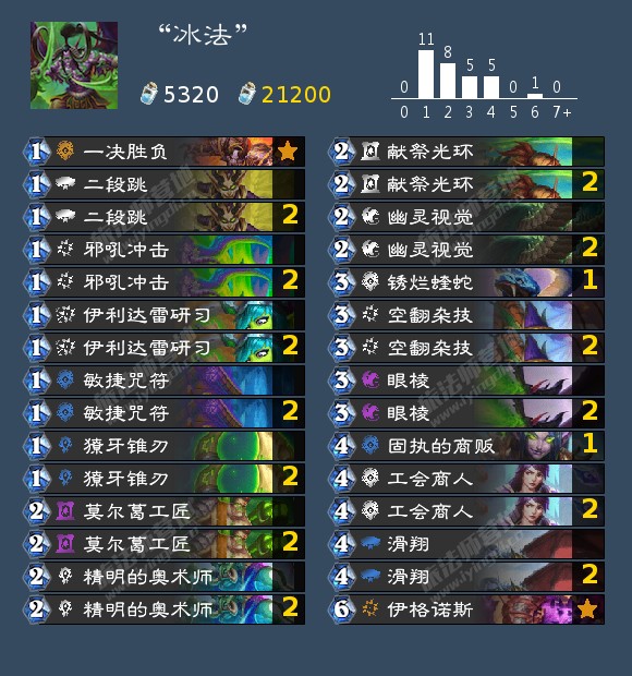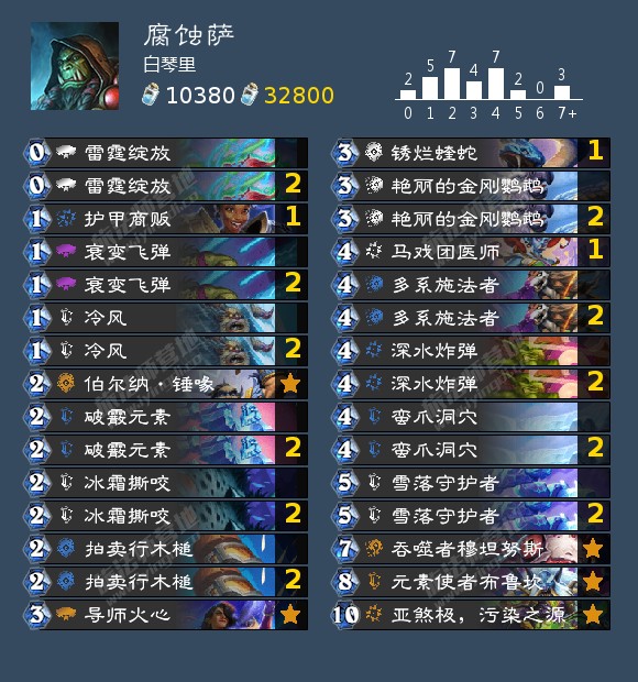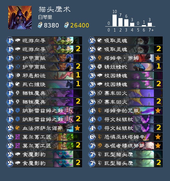 这次最拥抱新版本的两人刚好都来自国服,他们都带了腐蚀萨(不知道驴鸽的影响有多少),这其中的冰萨部分绝对是奥特兰克目前最有影响力的体系。白琴里带的新卡数量比最少的4人加起来还多,他还带了猫头鹰术和圣契骑,天命则是有决斗法——区区2张虹吸也已经是相当的新意了。斯卡布斯、雪落守护者、深铁穴居人这些新卡里的话题焦点总归还是悉数出场。