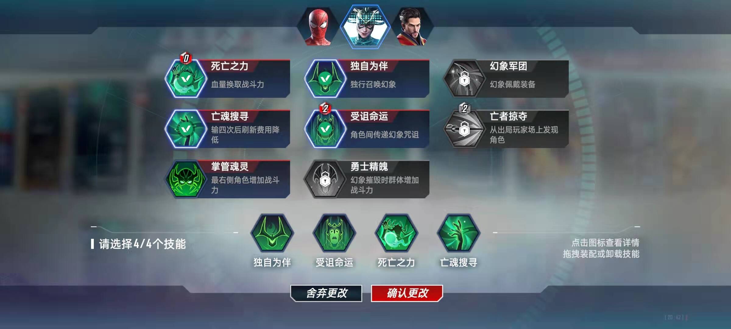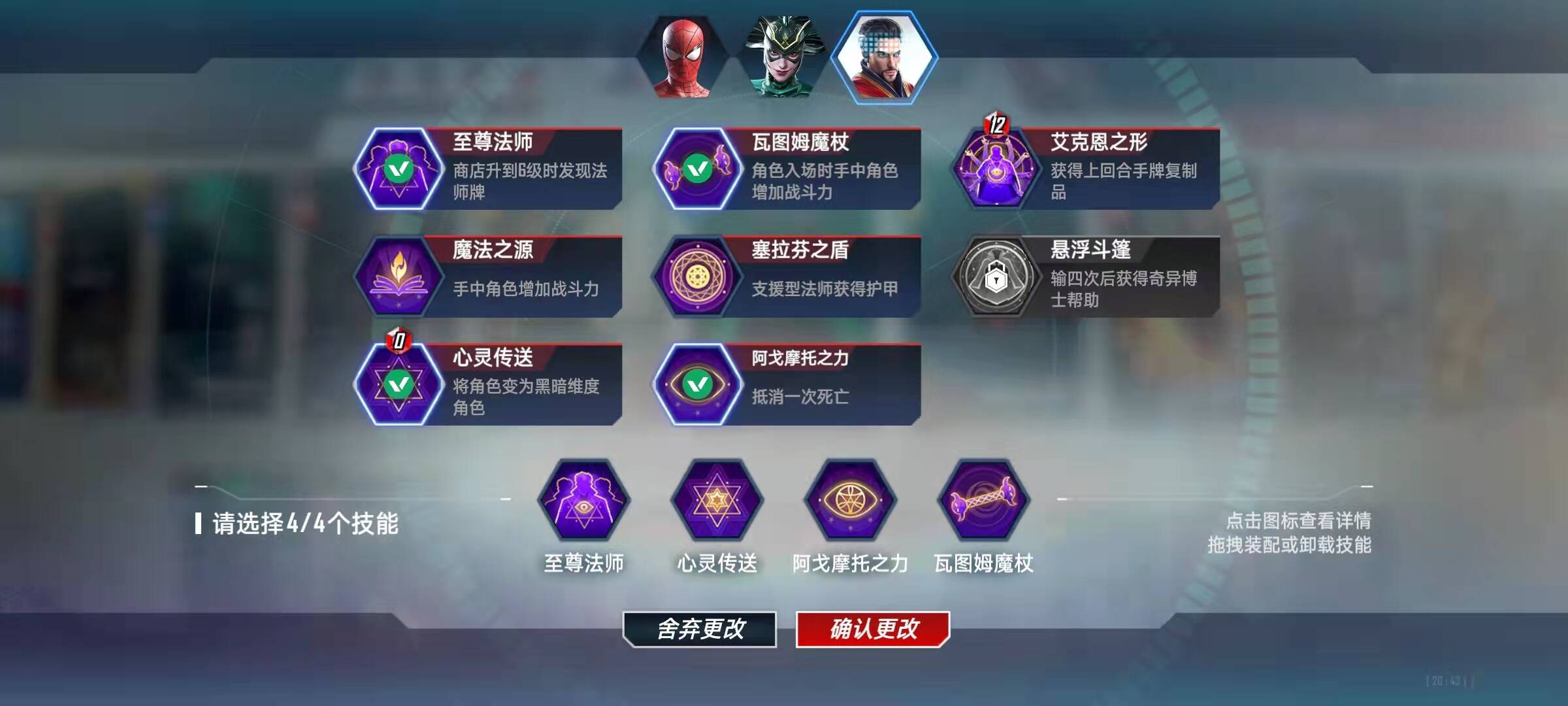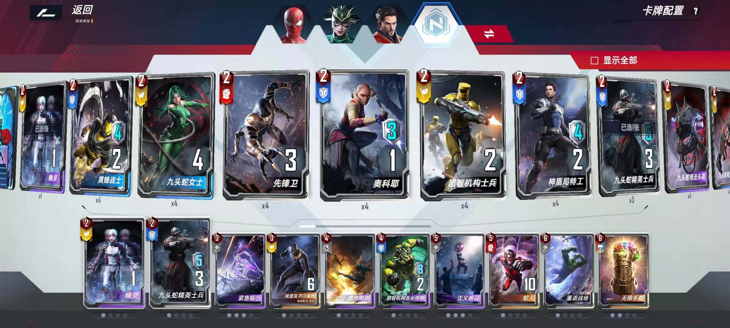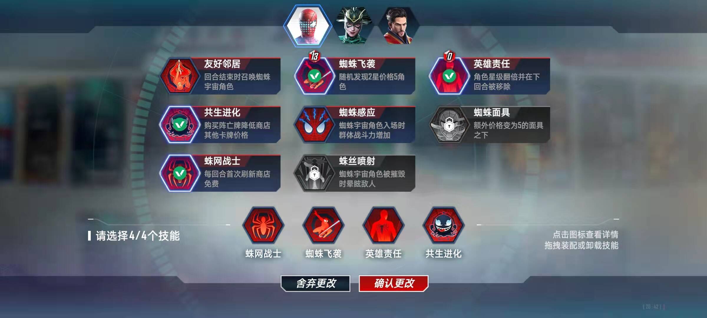 技能选择方面,主要还是以博士的技能为主(如果有蜘蛛侠氪金技能英雄责任,可以优选英雄责任,博士节能起码要给2个宝石,4个最好,如果没有宝石,可以选蜘蛛侠的)(如果有星爵技能携手破敌,可以看2.0里的卡组)。