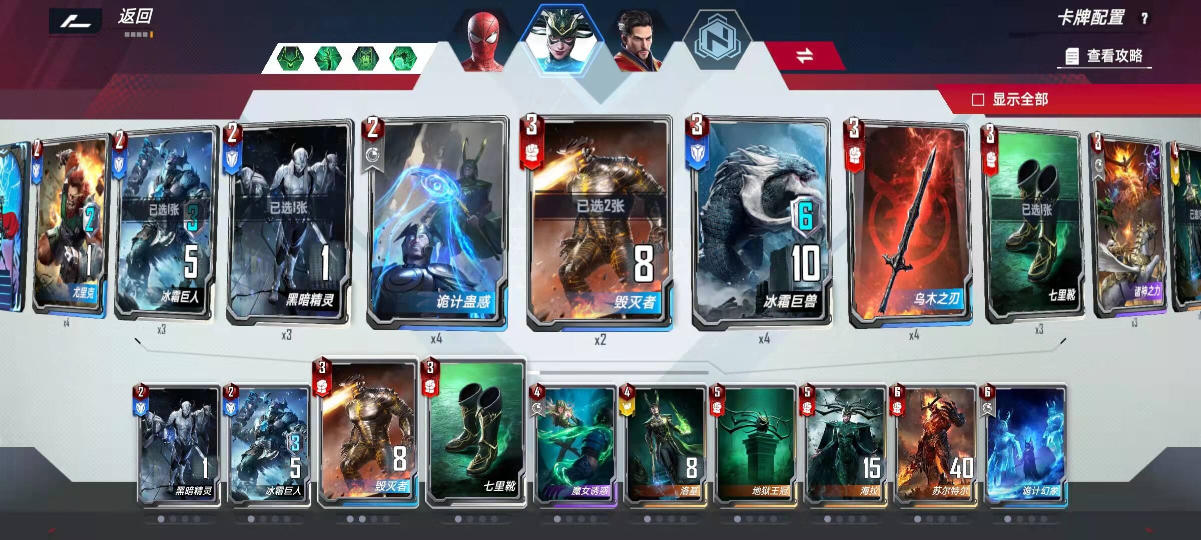 毁灭者/海拉and终幕:这三张卡想多说两句,先说海拉和终幕,我们五费一般一张带地狱王冠,另一张带海拉或者带一张终幕黄昏降临,我更建议带黄昏降临,一方面比较容易获得,并且还搏一搏,你不拿的时候海拉和终幕没区别。但如果拿的话,毕竟目前独行卡就这么几张,抽到苏尔特尔就赚到,前期站场还是变成维度都有不错效果,抽到海拉和带海拉一样的,抽到毁灭者,可以给你毁灭者升星,也算滤牌,当然毁灭者这个选择主要还是个心里安慰,主要还是抽苏尔特尔,因为我们六费也带了苏尔特尔。同时我和朋友WoW小哇,我们也有讨论过这个卡组如果**四张诸神黄昏终幕卡,是不是变成维度下场后一样可以直接独行,要是可以那就太爽了,海拉就相当于多玛姆,毁灭者独行也很强,刽子手就变成加强钢铁侠。但比较可惜的是我们都没有拿到四张终幕没法尝试,如果有条件有兴趣的朋友,可以尝试尝试,希望能给我一个反馈,ヾ(≧∇≦谢谢≧∇≦)ノ