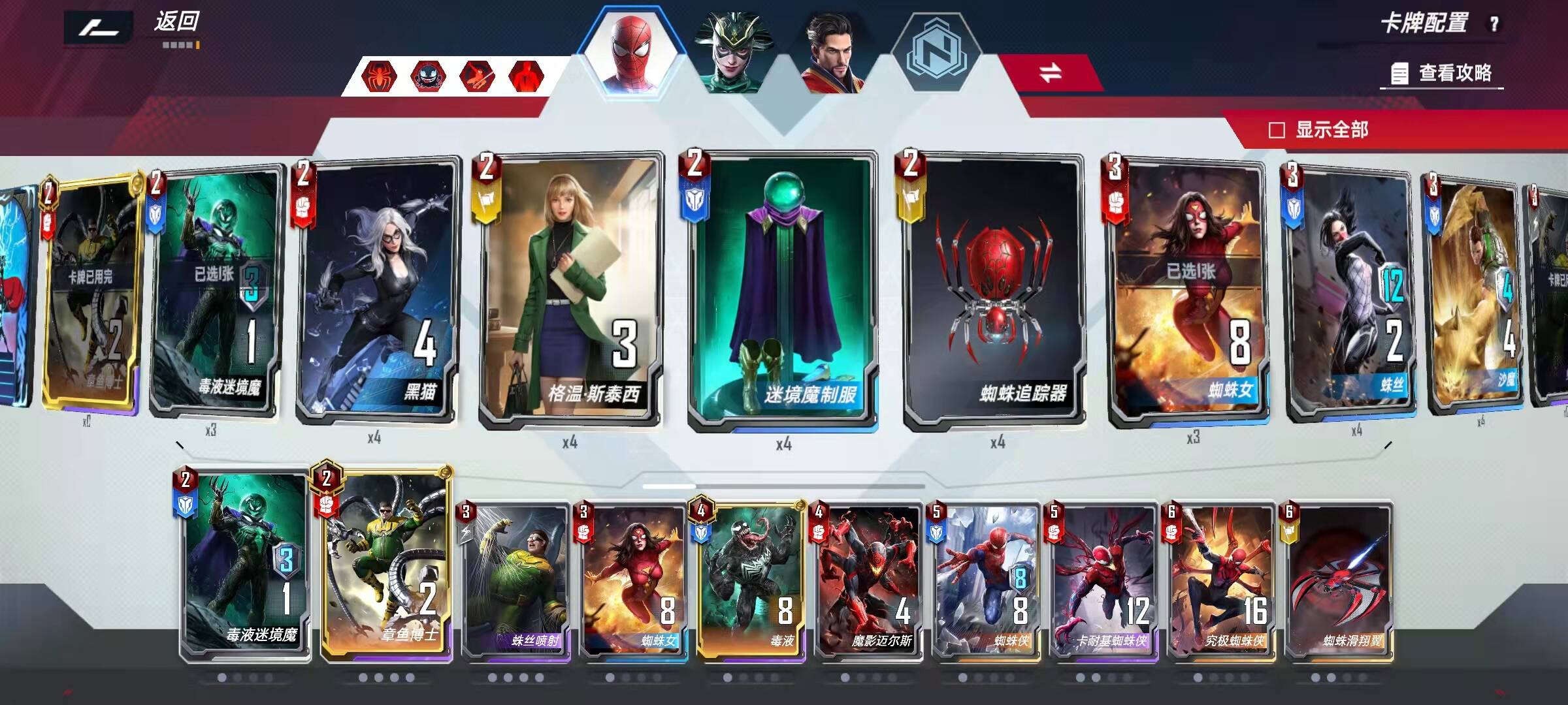 而蜘蛛侠的随从目前来说质量很优,并且有蛛丝喷射(打先手还能保自己卡西利亚斯)、5费蜘蛛侠(放在第一位,打黄队用处很大)等,配星爵和海拉都很不错,中期卡西利亚斯带勇度飞箭召唤下来的随从越打越猛,这套卡组,我配的是海拉,中期带七里靴的时候,章鱼博士和蜘蛛女可以越墙打C,很多时候不输星爵的勇度飞箭,当然如果有携手破敌,我建议带星爵也不错。