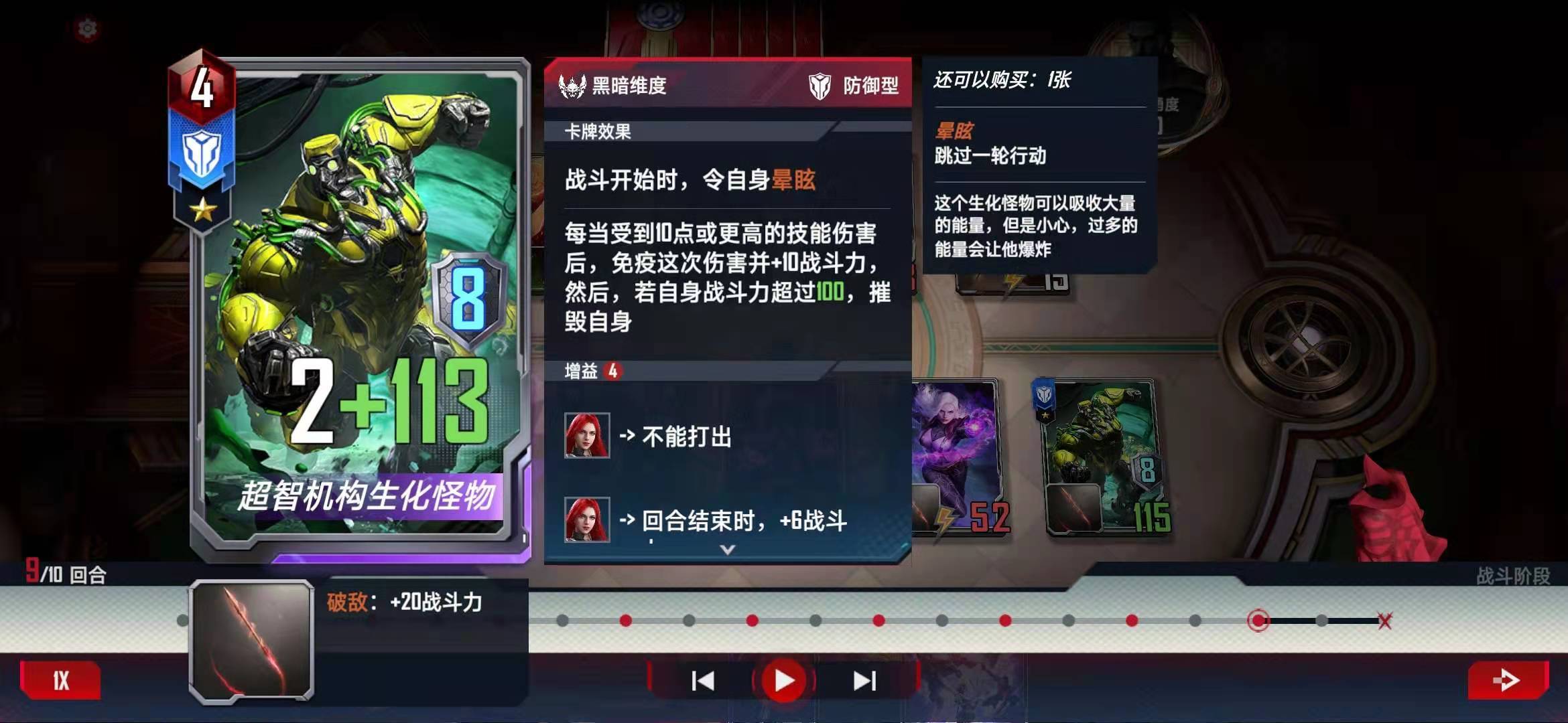 超智机构生化怪物:4费中立可以替换的卡很多,如果用这张牌建议带两张,这个牌单用站场,用好了可以挡着光谱,而用心灵传送的时候,定位很多时候和洛基类似,当它变成黑暗维度的时候,就没有超过血量上限会自爆的问题,拿到心灵维度后,可以看一下场上其他家黄队数量来决定,反正怎么说呢,打黄队很欢乐。同样可以替换成姆巴库、女鹰眼之类,带姆巴库同样需要看一下场上其他有几家黄队。打黄队效果好,没有可以继续换别的,实在不行,一张摩多客啥的纯粹过滤也行。