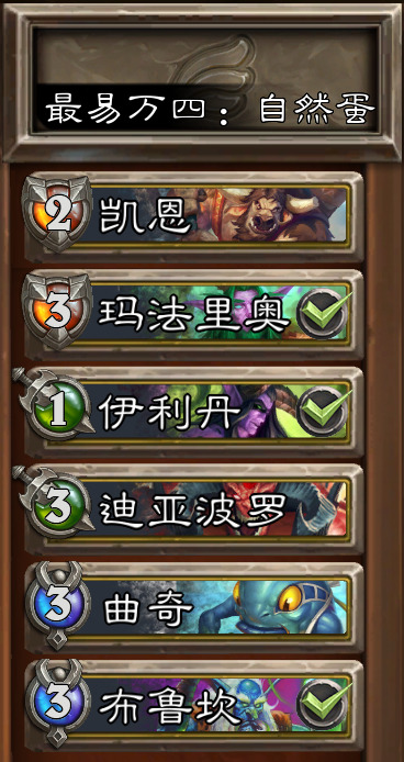 阵容选择——凯恩·血蹄(3技能加伤害)、玛法里奥(自然回血)、伊利丹(1技能+10攻)、迪亚波罗(续航)、曲奇(群体加血)、布鲁坎(闪电链)
