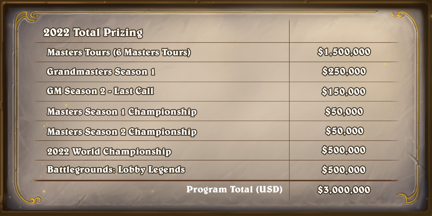赛事奖金对于广大观众往往并不重要,但在电竞计划里它就是最重要的指标。2022年全球竞技炉石的总奖池依然还在缩减,虽然6站巡回赛和全球总决赛奖金不变,还多了两届季赛总决赛和战棋的一系列大厅传说,但这几项新支出的数额明显小于特级大师联赛的缩水幅度(据特级大师确认)。其中全球总决赛虽然奖金不变,但也多了一倍的人来瓜分。
