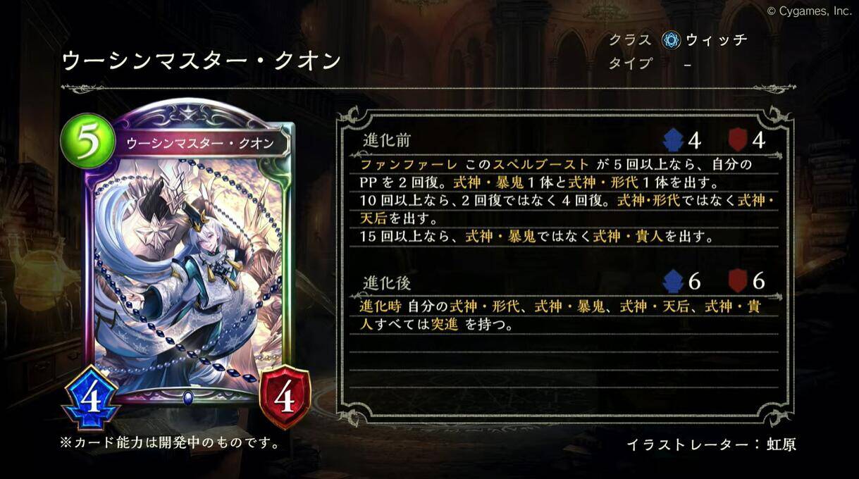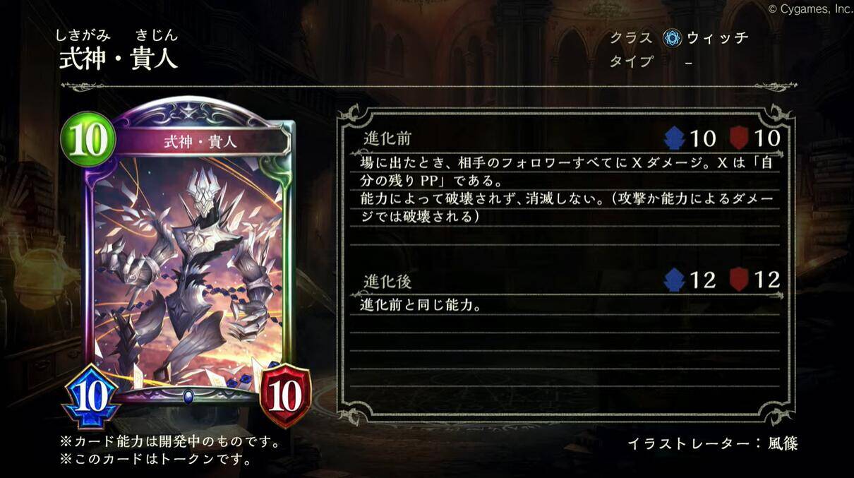 入场曲 如果这张牌的法术增幅次数为5次或以上,则会回复自己的PP 2点,召唤1个式神·暴鬼与1个式神·形代到自己场上。