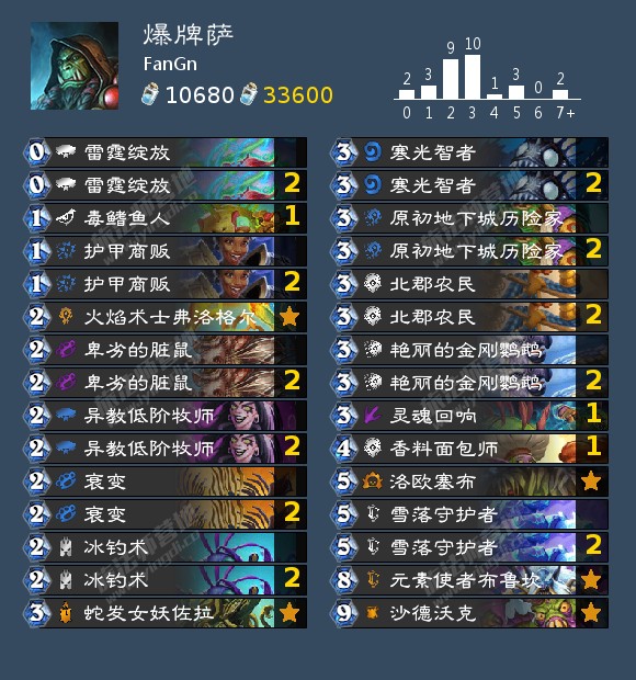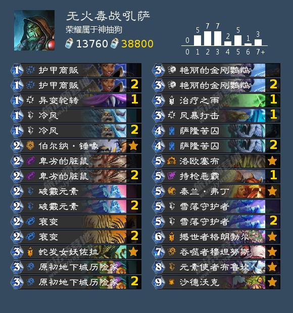 来自荣耀属于神抽狗的一套没有火焰剧毒组合鱼的战吼萨,他使用这套卡组以46场74%胜率打上了传说。