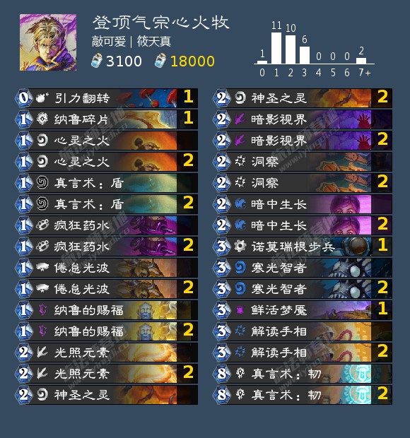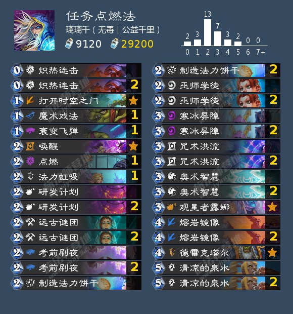 来自璃璃千的一套任务点燃法,他使用这套卡组打到国服第2。最近天梯上也出现了同类卡组,不少。