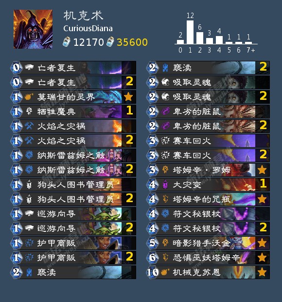 来自好奇的嘉然的一套机克术。最近这套卡组在国服很流行,有位ID叫“不过如此”的玩家使用这套卡组打到第23名。或许还有更高排名的玩家但是我实在不能知晓一切。
