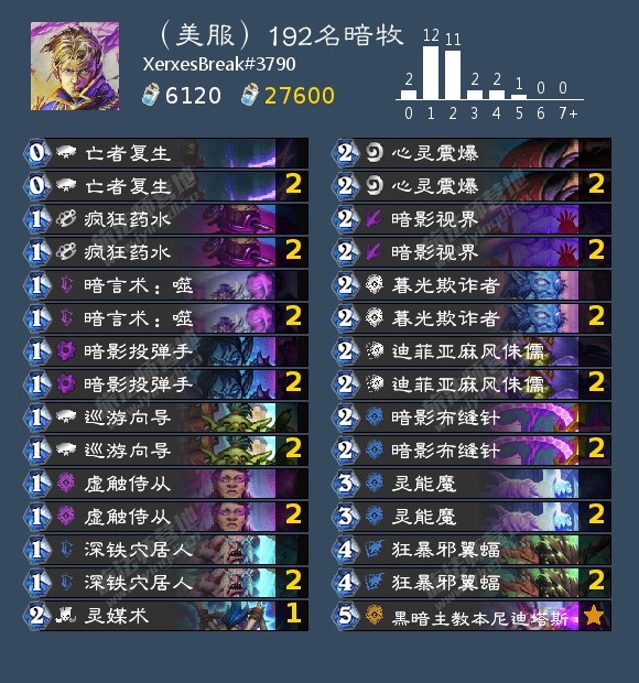这套卡组的思路其实类似T7猎和术士的结合,尽一切可能消减对手血量同时忽视自身血量,自残绝不手软。其速度更快,几乎没有卡组能以更快的速度击败暗牧。当然,弱点也有着一切快攻卡组的两个通病,一个是惧怕血量回复和叠甲,所幸这类后期卡组已经被海盗战、冰萨和任务猎捕杀殆尽。另一个是过牌能力低下,经常会出现抽1打1的局面,这则需要我们构筑一套单卡可以构成多重配合的卡组。