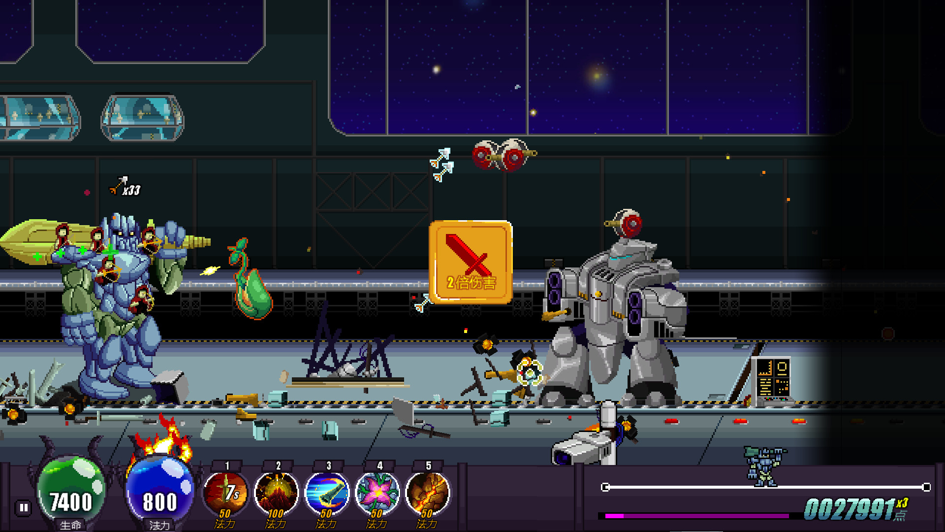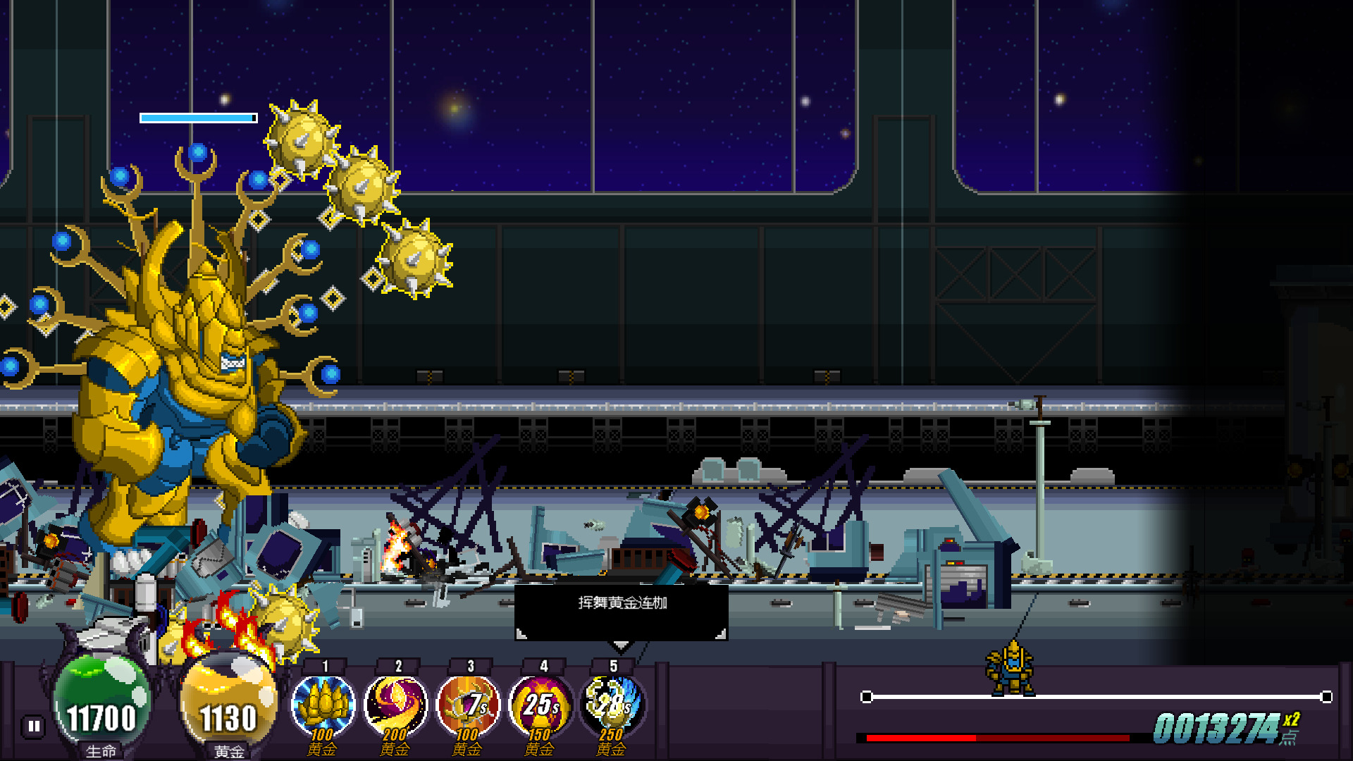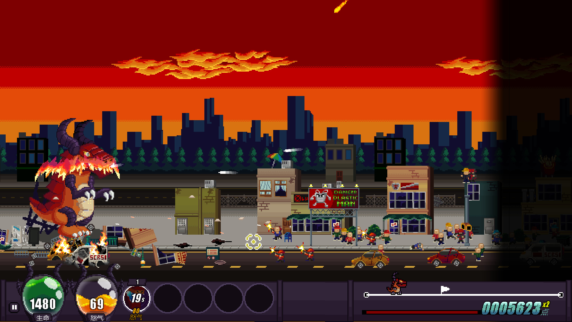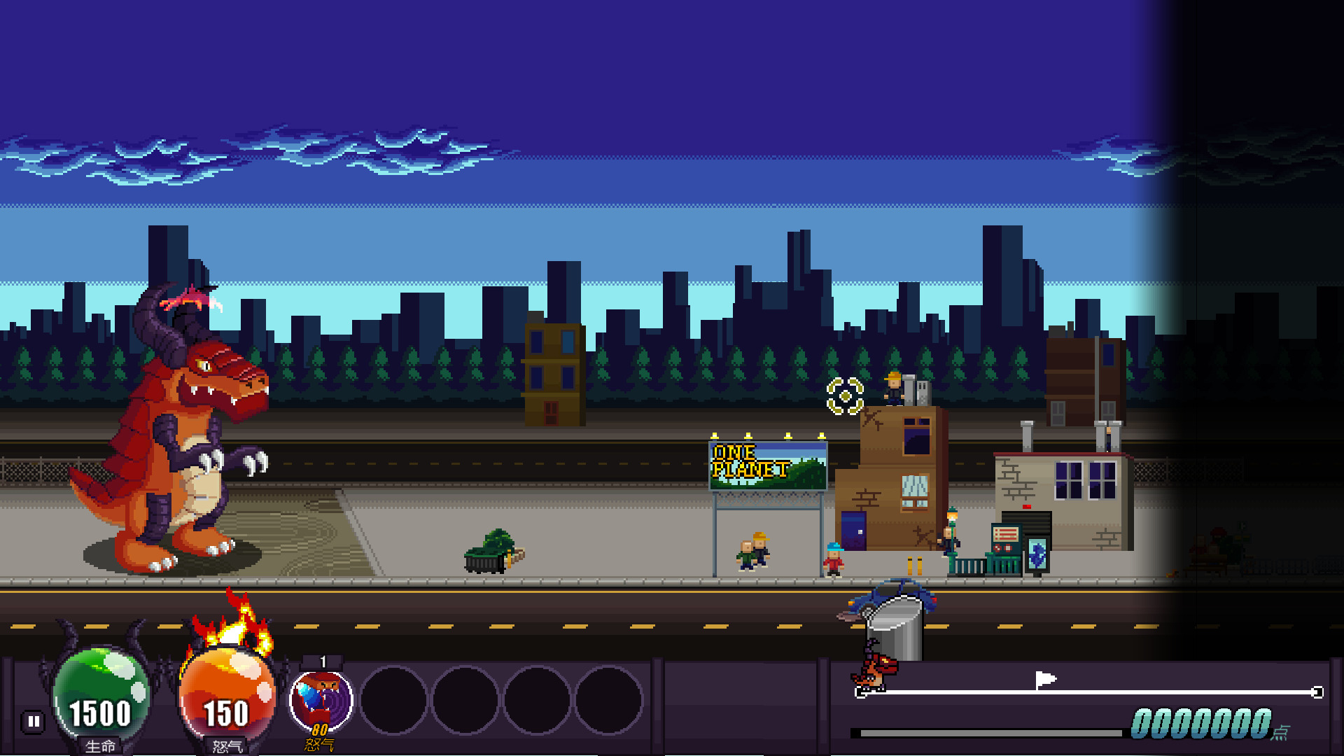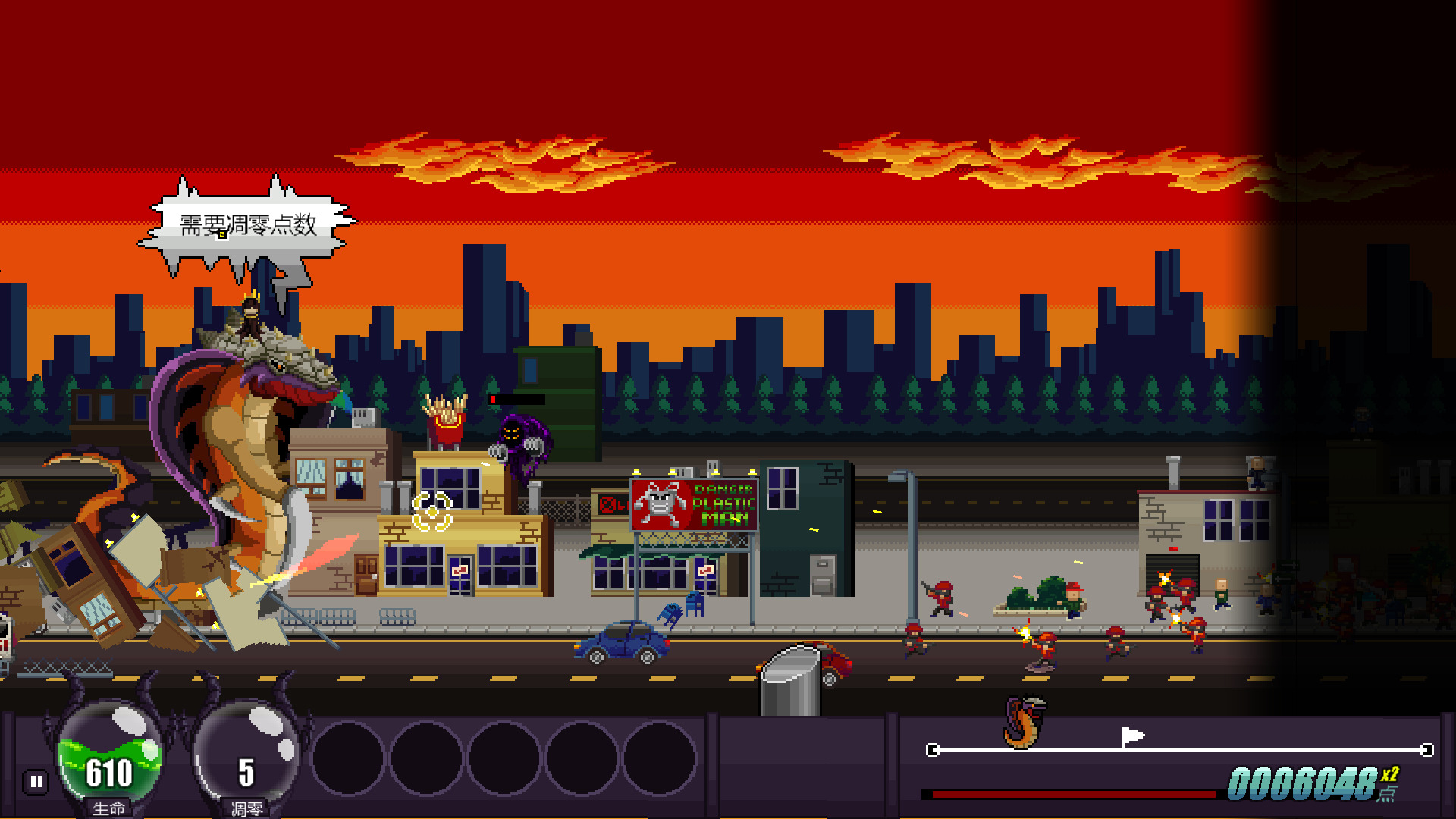 右下角是整个关卡的长度,如果能到达终点就算做游戏胜利。随后根据破坏程度计算积分。